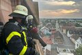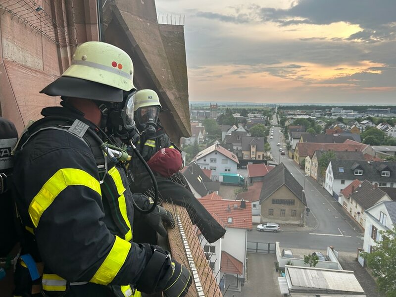 Zeitgleich wurde draußen der Lüfter vorbereitet und die ersten Rohre für den Löschangriff vorgenommen. Schnell wurden die ersten Verletzten gefunden und zur weiteren Behandlung nach draußen gebracht. Nachdem die Trupps unter Atemschutz bis in den Turm vorgedrungen sind, durfte trotz des Dummies ein kleiner Blick in die Ferne nicht fehlen, die Aussicht ist jedes Mal bemerkenswert.
