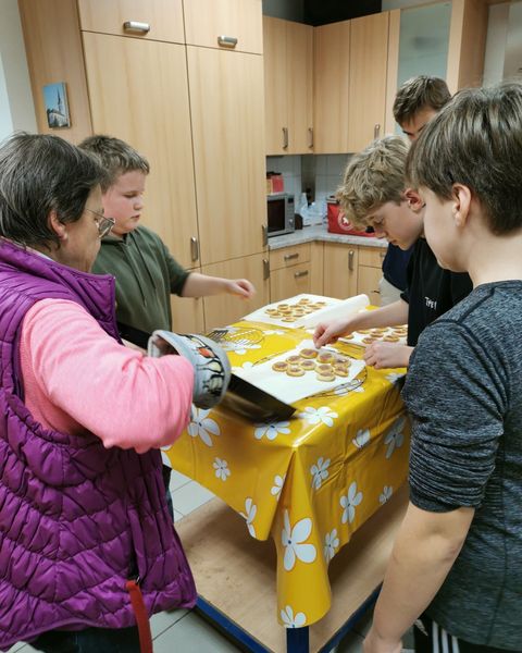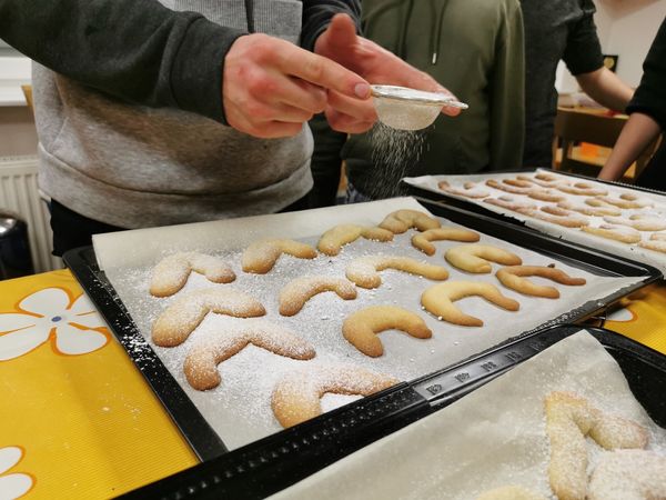 In der letzten Übung vor der Weihnachtsfeier wurden traditionell wieder Plätzchen gebacken. Nachdem die Hände gewaschen und die Ärmel hoch gekrempelt waren, ging es ans Ausrollen und Formen der verschiedenen Teige. Manche Plätzchen wurden mit Marmelade gefüllt, andere mit Puderzucker bestreut. Alle haben fleißig mit angepackt. Am Ende durfte eine Kostprobe natürlich auch nicht fehlen.