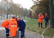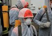 Im Hintergrund wird bereits der Dekontaminationsplatz (Dekon-Platz) aufgebaut, welcher zur Reinigung der zurückkommenden Einsatzkräfte dient. An dieser Schleuse werden die Einsatzkräfte nach getaner Arbeit von weiteren Kräften erwartet, ausgerüstet mit einer Filtermaske, Gummistiefeln, Handschuhen und Schürze. Sie werden noch im CSA Anzug einzeln abgeduscht und mit Bürsten von den gefährlichen Stoffen gereinigt. Danach wird der Anzug unter genauen Vorgaben ausgezogen. Das der Anzug nur auf der Innenseite angefasst wird ist nur eine davon.