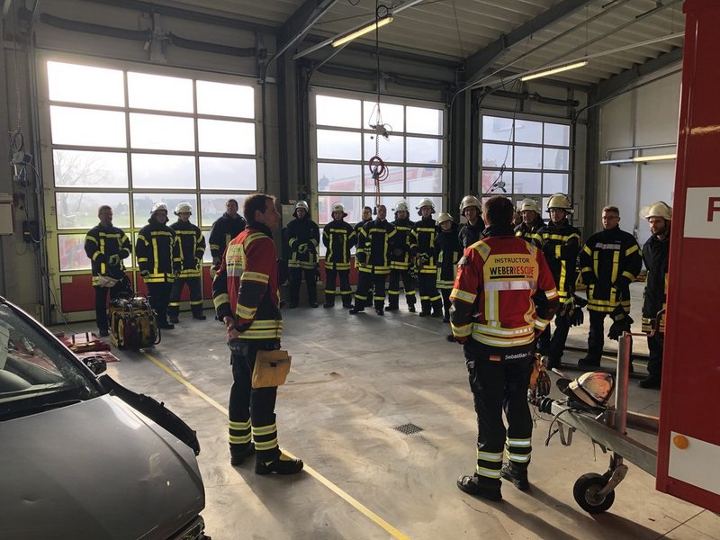25 Einsatzkräfte aus allen fünf Stadtteilfeuerwehren Riedstadts trafen sich bereits am frühen Morgen im Feuerwehrhaus in Leeheim, um sich, angeleitet durch zwei externe Ausbilder der Firma Weber Rescue Systems, in Theorie und Praxis fortzubilden.