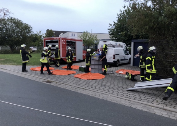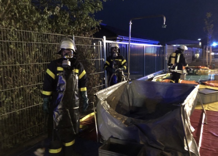 In kürzester Zeit gehen die ersten Kameraden unter Atemschutz in Chemikalienschutzanzügen (CSA) auf Erkundung um sich ein Bild über die Lage zu machen. Ihre ebenfalls unter Atemschutz eingesetzten Kollegen schlagen entstehende Dämpfe mittels feinstem Wassernebel nieder. Benötigen sie Geräte für ihre Arbeit, müssen sie an die Absperrgrenze um von einem Trupp die gewünschten Geräte gereicht zu bekommen.