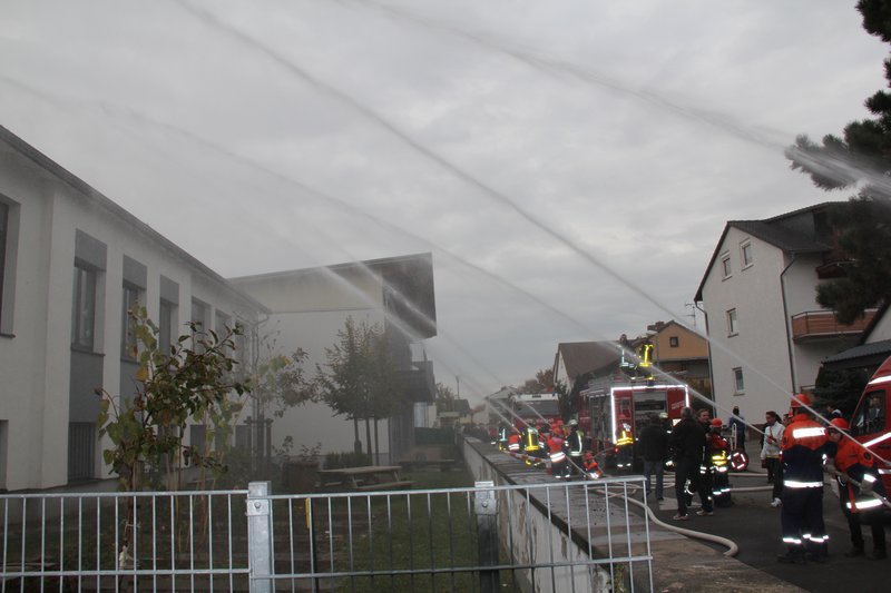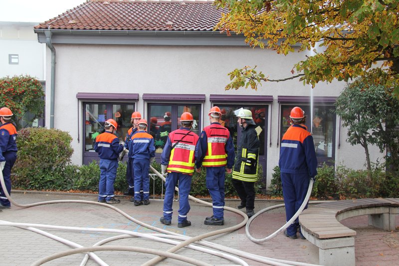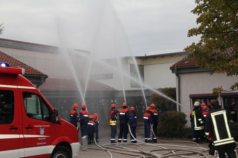 Übung: Vier Riedstädter Jugendfeuerwehren löschen gemeinsam angenommenen Brand an der Wolfskehler Grundschule