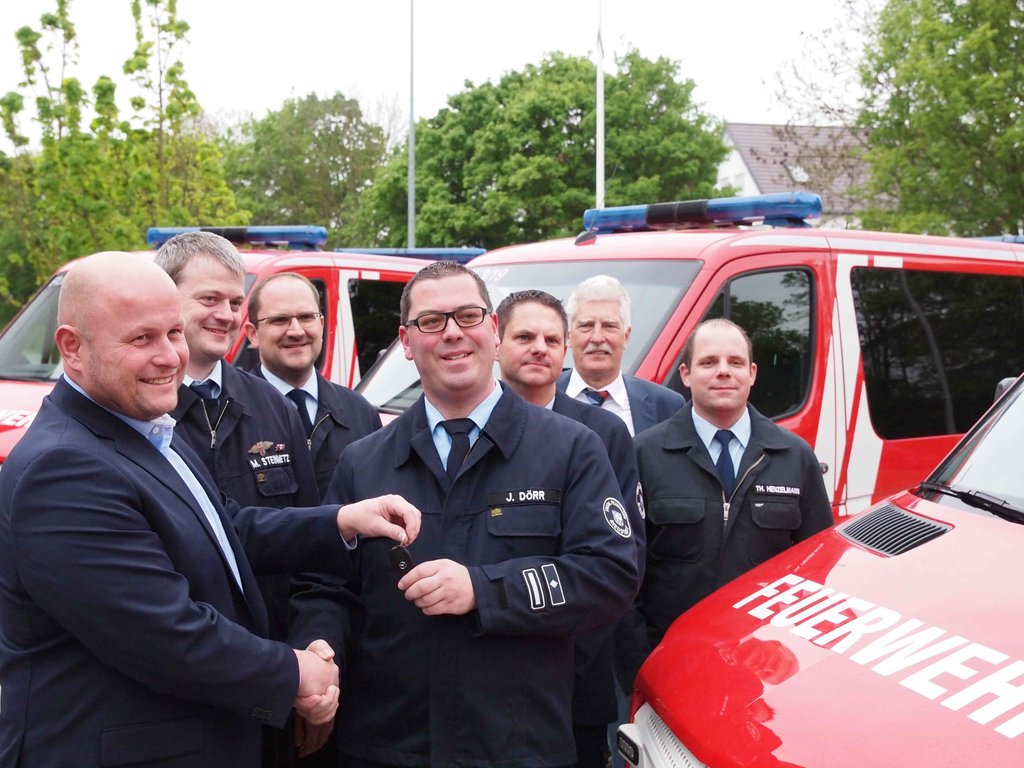 Bürgermeister Marcus Kretschmann hat im Beisein seines Amtsvorgängers Werner Amend und des Stadtbrandinspektors Markus Kölsch am vergangenen Freitag (21.4.) drei neue Fahrzeuge an die Einsatzabteilungen der Feuerwehr in Erfelden, Goddelau und Leeheim übergeben.