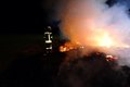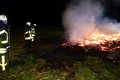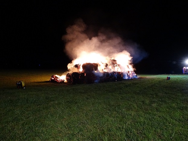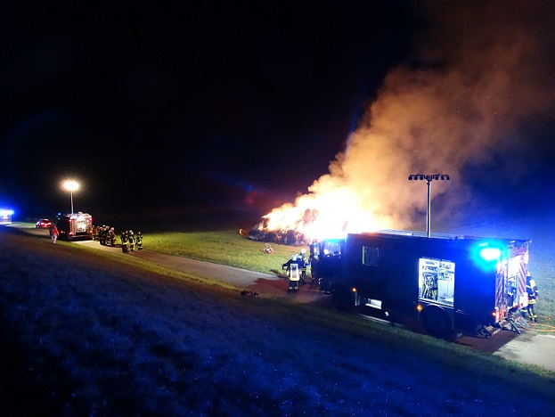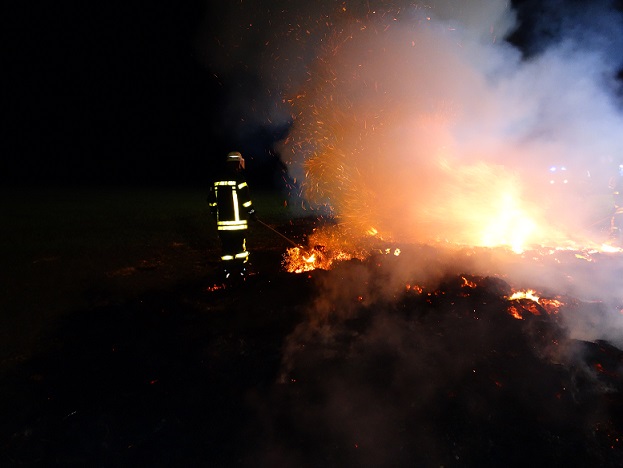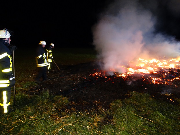 Der dritte Einsatz an diesem Wochenende. Erneut wurden die Feuerwehren aus Erfelden und Leeheim alarmiert. Diesmal brannten an einem Feldweg hinter dem Kieswerk Fretter 85 Strohballen. Da diese nicht mehr zu retten waren und auch keine akute Gefahr einer Brandausbreitung bestand, ließ man die Strohballen kontrolliert abbrennen. Um dies zu beschleunigen, wurden drei Überdrucklüfter in Stellung gebracht und das Stroh mit einem Traktor auseinandergezogen.