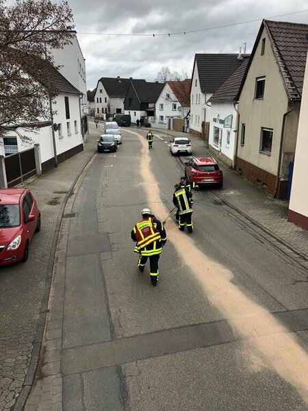 Am 18.02. wurden die Einsatzkräfte der FFW um 14.40 Uhr alarmiert. Entlang der Gernsheimer Straße waren Betriebsststoffe aus einem Transporter ausgetreten.