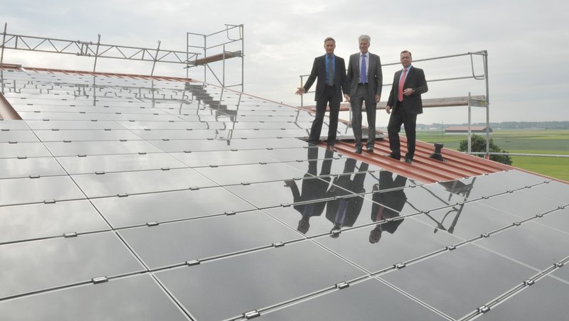 Bild: Erster Kreisbeigeordneter Walter Astheimer, Bürgermeister Werner Amend und Kreissparkassenvorstand Heiko Dennert (v.l.) informierten sich über die neue Photovoltaikanlage auf dem Dach des Leeheimer Feuerwehrgebäudes.