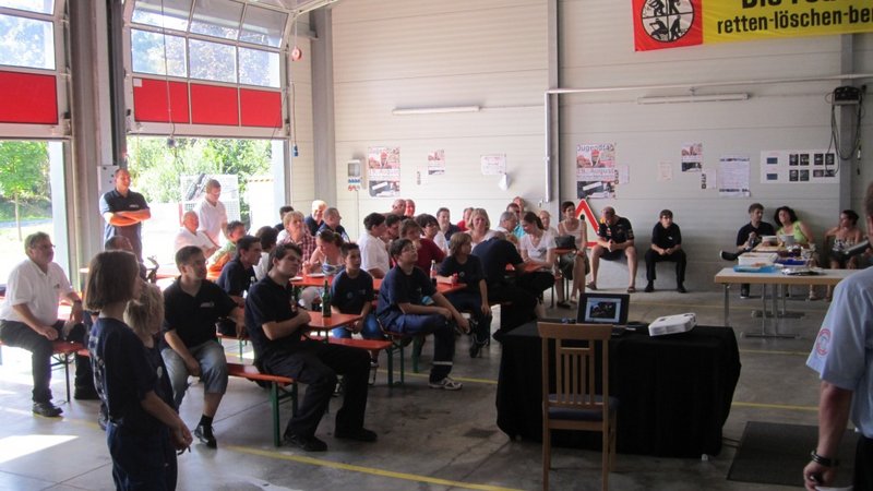 In der Fahrzeughalle konnten sich Eltern und Jugendliche bei einem Vortrag des Jugendwartes Lars Löcke und des Spielmannszugführers Karl-Ludwig Ewald über die Organisation die Ziele der Ausbildung informieren.