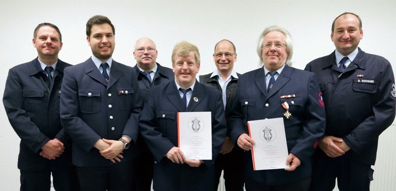 Ehrung für 40 Jahre aktiven Feuerwehrdienst und Ehrenzeichen für 40 Jahre Feuerwehrmusiker. Quelle: haza-foto