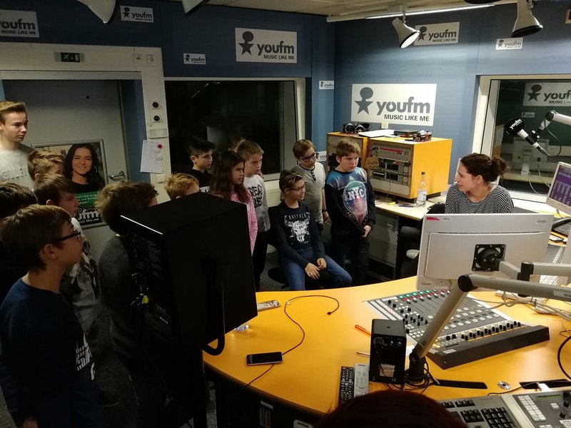 Anschließend starteten wir unseren Rundgang über das Gelände. Das erste Highlight war der Konzertsaal, danach durften wir zu Youfm. Hier wurde uns im 2. Studio die Arbeit hinter dem Radio eindrucksvoll näher gebracht. Interessiert lauschten unsere Jugendlichen, wofür all die Knöpfe und Bildschirme gut sind und was passiert, wenn die rote Lampe leuchtet.