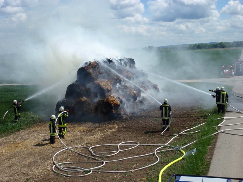 Bei einem Feuer im Außenbereich werden tagsüber immer zwei Feuerwehren zeitgleich alarmiert, um sofort genügend Personal und Ausrüstung für lange Wasserversorgungsstrecken vor Ort zu haben. 16 Einsatzkräfte aus Wolfskehlen waren mit allen Fahrzeugen zur Brandstelle geeilt, unterstützt von den Kameraden aus Leeheim. Leider standen die Strohballen bei Eintreffen der Wehren bereits im Vollbrand. Ein vom Eigentümer der Ballen zur Verfügung gestellter Radlader warf die Ballen auseinander, anschließend wurden sie aufwändig abgelöscht. Die Wasserversorgung konnte von einem Feldbrunnen gewährleistet werden.