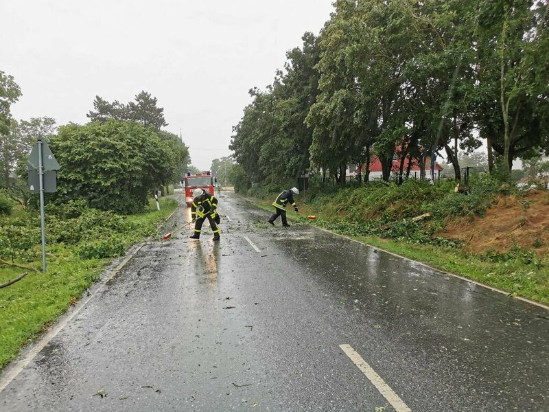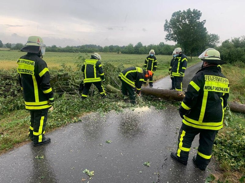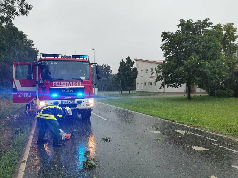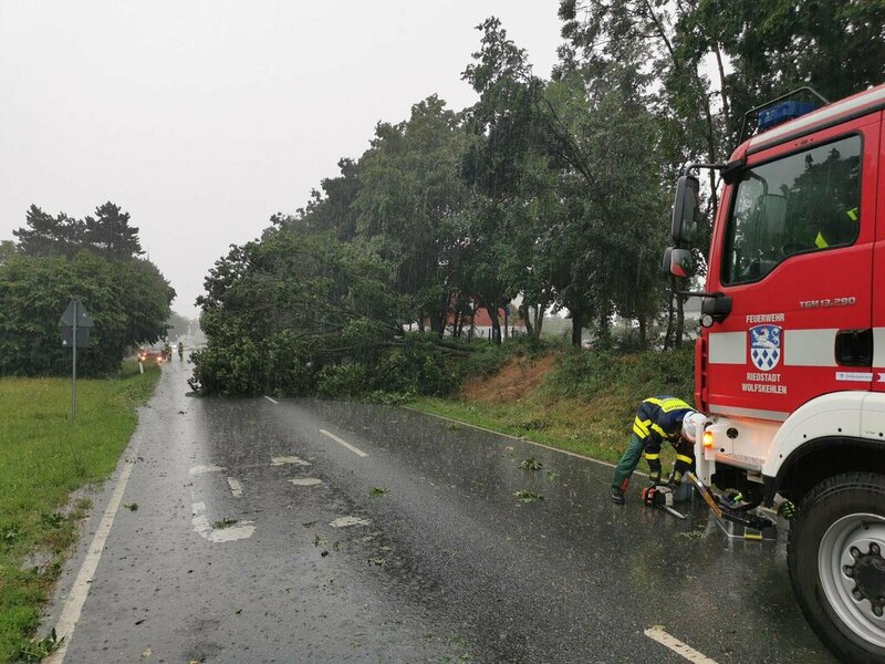 Um 16:16 Uhr wurde die Freiwillige Feuerwehr Riedstadt-Wolfskehlen zu ihrem ersten Einsatz in die Groß-Gerauer Straße, wenige Meter vom Gerätehaus entfernt alarmiert. Hier ist in höhe der Sporthalle ein 10-15m hoher Baum umgestürzt und lag quer auf der Straße. Die Einsatzstelle wurde zwischen der Brienner Straße und der Heinrich-Heine Straße für den fließenden Verkehr gesperrt. Im strömenden Regen wurde durch die Kameraden mit einer Kettensäge der Baum entastet und zerteilt und die Einzelteile von der Straße geräumt.